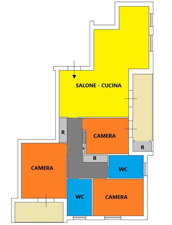 La casa č suddivisa in ingresso in ampia zona giorno, con salone doppio e cucina a vista, corridoio, 3 camere, 2 bagni e doppia balconata con presenza di locale tecnico per caldaia su uno dei balconi.